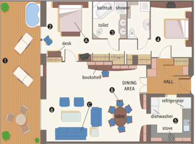 ( Complete the sentence with is, isn't or are, aren't and the name of the room. don't forget to check the numbers in the picture)