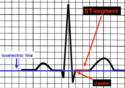 For the fifth step, consider the ST segment. ST segments can be elevated or depressed from the iso-electric line. The ST-segment is said to be depressed if it slopes down 1mm or more from the J-point, or is depressed 1mm or more horizontally. ST-segment elevation of up to 3 mm in the right-sided chest leads, and up to 1 mm in the limb leads may be normal, and is referred to as early repolarisation.