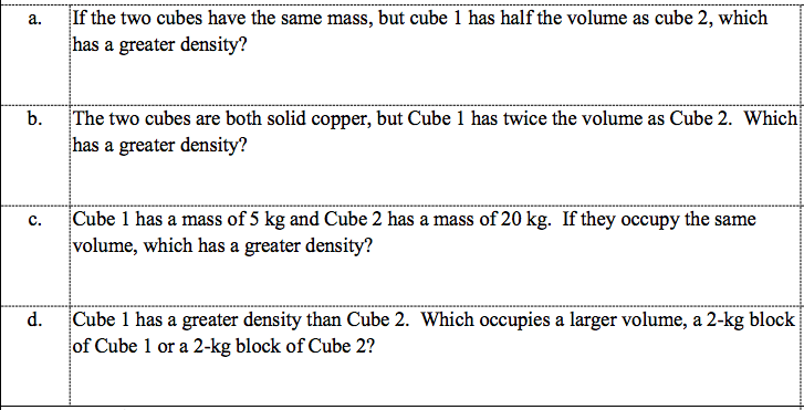 The ratio of an object's mass to its [blank_start]volume[blank_end] is call the density of the object.