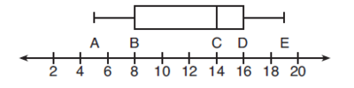The box-and-whisker plot shown below represents the number of magazine subscriptions sold by members of a club. Which statistical measures do points B, D, and E represent,