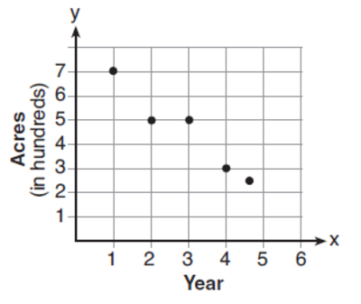 The graph below illustrates the number of acres used for farming in Smalltown, New York, over several years. Using a line of best fit, approximately how many acres will be used