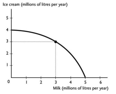 The figure above shows the production possibilities frontier for a country. A combination of 4 million litres of milk and 4 million litres of ice cream is