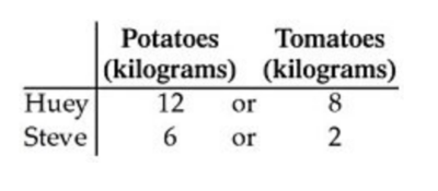 Huey and Steve can grow potatoes or tomatoes. The table above shows the kilograms of potatoes and tomatoes Huey and Steve can grow in a week. Based on the table, Huey's opportunity cost of producing one kilogram of tomatoes is