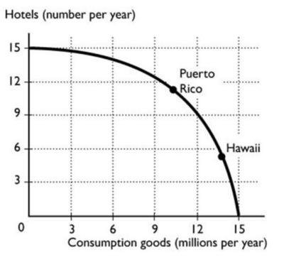 Suppose Puerto Rico and Hawaii currently have the same production possibilities so that the above figure is the PPF for hotels and consumption goods in the two areas. Hotels are a capital good that, once built, will help produce still more consumption goods. If Puerto Rico produces more hotels than Hawaii,
