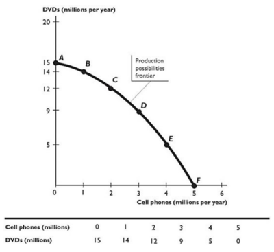 The figure above shows a production possibilities frontier. In the figure, when the economy moves from point C to point B, what is the opportunity cost of a DVD?