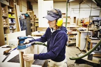 What is wrong with how the person in this image is dressed for working in the shop? (Check all that apply)