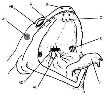 An image of a frog's mouth, label the major structures.