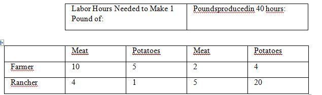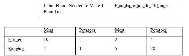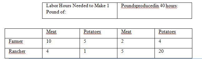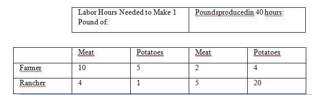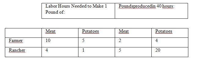 2.A rancher can produce only hamburgers, and a farmer can produce only french fries. The rancher and the farmer both like both foods. They