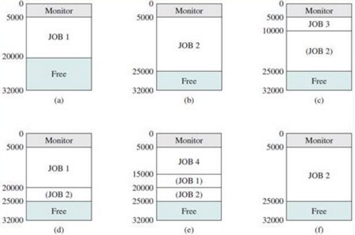 In (e) JOB4 is loaded. A portion of JOB1, written out to disk, is equal to