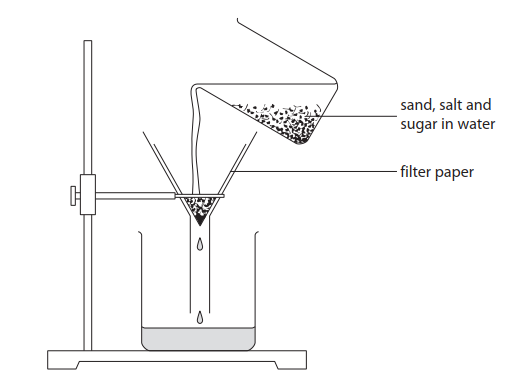 Milo separatesa mixture of sand, salt and sugar. He puts the solids into some water and stirs. Then he pours the mixture thrtough filter paper.