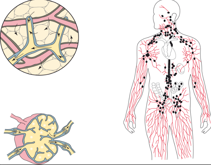 Tissue fluid drains into the [blank_start]lymphatic[blank_end] vessels. The fluid, called lymph, flows along the lymph vessels. It passes through lymph nodes and eventually returns to the blood via the lymphatic and [blank_start]thoracic[blank_end] ducts. As lymph passes through the lymph nodes any pathogens present activate [blank_start]lymphocytes[blank_end] and macrophages, which can then destroy the microbes.