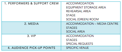TRANSPORT- products from overseas: customs, quarantine, timing- performers: expectations, meet and greet (airport & journey to site)ACCOMMODATION- artists, keynote speakers, MC, sporting personalities etc...- quality of accommodationARTIST NEEDS- storage and movement of equipment- on-site needs: food, rink, change rooms- anticipate on-site needs- event manager needs to be sensitive to culturally based requirements