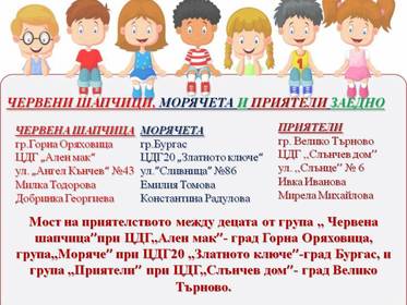 Мост на приятелството между децата от група ,, Червена шапчица''при ЦДГ ,, Ален мак '' - град Горна Оряховица, група ,, Моряче '' при ЦДГ20 ,, Златното ключе '' - град Бургас, и група ,, Приятели " "при ЦДГ ,, Слънчев дом '' - Търново Държава Държава град албена Велико албена Цел на английски английски проекта:Цел на проекта: Да се открият нови възможности за формиране на умения за общуване между децата на възраст 4-5 КАТО Основа за ГОДИНИ културно Поведение и пълноценно Развитие на английски Детската личност.