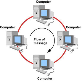 Ring network's are also peer-to-peer networks because there is no server. About the Ring Topology:- All the computers are arranged in a circle- Data sent by one computer passes around the ring until it reaches the correct computerAdvantages: - Does not depend on a central computer- Each computer has the same access, so no computer can traffic the network.Disadvantages:- If there is a break in the connection, whether wires or wireless, the whole network will fail.- Faults are difficult to locate- The network cannot be kept running whilst new equipment is being added or removed as there is only one path the data can follow.