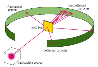 Big alpha particles (nuclei of helium atoms -> 2p+) were directed at a very thin sheet of gold foil Predicted there would be some deflection – due to positive charges distributed throughout the gold BUT….Most particles passed straight through -> concluded that atom is mostly empty space!A very small fraction bounced off foil at very large angles – so must be regionof positive charge