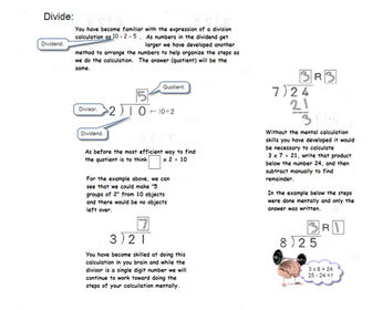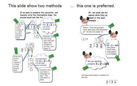This set of slides introduces division of 2 digit numbers by a one digit number. Two methods are shown ... but the method which maximizes the use of your mental skills is certainly preferred.