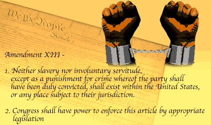 Passed by Congress on January 31, 1865, and ratified on December 6, 1865, the 13th amendment abolished slavery in the United States and provides that "Neither slavery nor involuntary servitude, except as a punishment for crime whereof the party shall have been duly convicted, shall exist within the United States