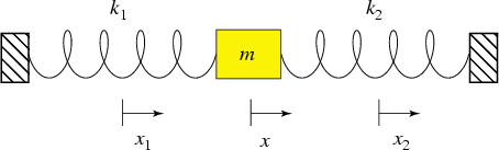 The mass in the diagram is tethered between 2 identical springs. When you pull the mass to 1 side and let go, it oscillates backwards and forwards.What pulls the mass back to the centre each time?When the mass is displaced to the left, X1 decreases & X2 increases so the resultant pull of the spring is to the right. Similarly, when the mass is displaced to the right, the resultant pull is to the left, to the centre. The more displace the mass, the greater the resultant force that pulls it back.How does this affect the acceleration?Newton's 2nd law tells us that the greater the force, the greater the acceleration. So greater the displacement away from the centre, the greater the acceleration