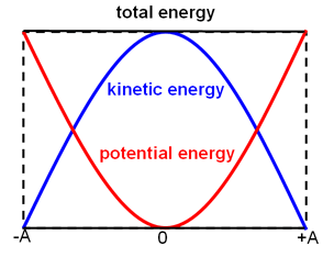 Imagine yourself back in a swing. At which points do you have your maximum and minimum K.EAt the maximum amplitude of your swing, you're stationary for a moment. At these 2 points your K.E is 0. Your K.E reaches its maximum as you approach the centre.Energy is always conserved which means that when your K.E is at 0, your potential energy is at its maximum as a result, as you move towards the centre: your GPE is converted to K.E.This means that the total energy of the system remains constant. Potential energy is 0 at the equilibrium position.The graph shows how the GPE & K.E vary with displacement for an object moving with SHM