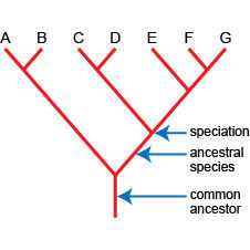Caption: : Phylogenetic trees. The closer the branches, the closer the evolutionary relationship. F and G are more closely related than G and E. The earliest species are found at the base of the tree and most recent at the tips. They are produced looking at similarities and differences in species' physical characteristics and genetic makeup. Most evidence is from fossils.