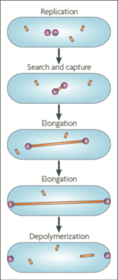 Par M encodes actin like filaments that polymerise to form filaments. In combination with Par M, Par R encodes DNA binding adaptor protein and Par C encodes a centromere like region. Partitioning complex formed by replicated plasmids paired by Par R, bound to Par C. Par M filamentation occurs once the complex is formed, and polymerisation pushes the plasmids to opposite poles, at which point the filament depolarises.