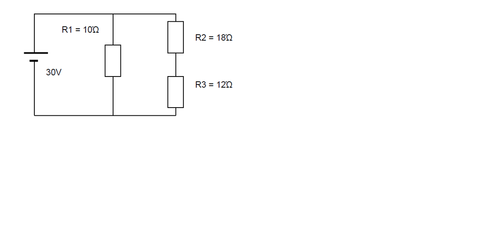 Step one: Calculate first the total resistance of the circuit: The equivalent resistance for R2 and R3 is: R2-3 = 1/R2 + 1/R3 = 7.2ohms R total = R1+ R23 = 10ohms + 7.2 ohms = 17.2 ohmsStep two: Calculate the Total Current V/R=I I1 = 30V / 17.2 Ohms = 1.74 Amp. (Since R1 is in series connection, the total current is the same for that path).Step three- calculate voltage drop across each resistor To Calculate the voltage drop for R1 you: VR1 = 1.74 Amp x 10 ohms = 17.4 volts Calculate the voltage drop across R2 and R3. Since the equivalent resistance for R2 and R3(R23) as calculated above is 7.2 ohmsStep 4- We can now calculate the voltage across each parallel resistor.Calculate the total voltage across R23 using IxR=V 1.74 x 7.2 = 12.528V, we can now calculate the individual current for R2 and R3I2 = VR2 / R2 = 12.5 volts / 18ohms = 0696 Amp. I3 = VR3 / R3 = 12.5 volts / 12ohms = 1.044 Amp.