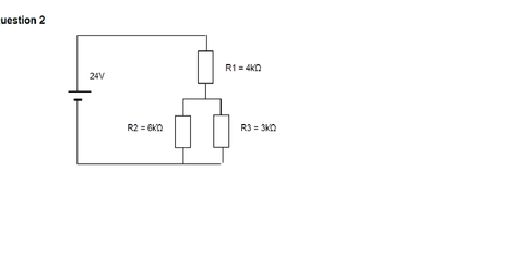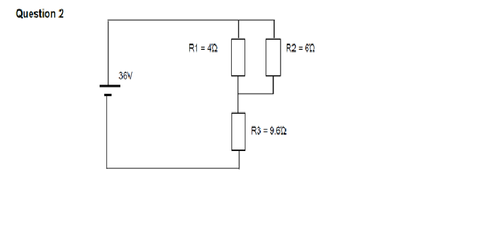 a) Calculate the current in resistor R2 Step one: calculate total resistance of R1 and R2 in order to turn the circuit into a series. In order to find total resistance you do: 1/R1 + 1/R2 = 1/R12 ¼ + 1/6= 1/R12 0.25 +0.17 = 0.417 (0.42) 1/0.42 =2.38 =2.4Ohms R12= 2.4 Step two: now you have the total resistance through R1 and R2 you have to find the total resistance of the circuit, by adding R12 and R3 together R12 + R3 =TR 2.4 + 9.6= 12 OhmsStep 3- to find the current in the circuit you need to divide the voltage by Resistance V /R = I 36 / 12 = 3A Step 4- you then need to find the voltage going through R12.V= I X R12V= 3 x 2.4V= 7.2 V Step 5- to calculate the current of resistor 2 you have to use the information we have found above and put the figures into the equation I= V / R7.2 / 6 =1.2A So current in resistor 2 is 1.2A