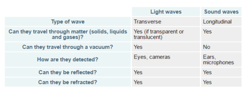 Light travels as waves. These are transverse waves, like the ripples in a tank of water. The direction of vibration in the waves is at 90° to the direction that the light travels.Light travels in straight lines, so if you have to represent a ray of light in a drawing, always use a ruler.Unlike sound waves, light waves can travel through a vacuum (empty space). They do not need a substance to travel through, but they can travel through transparent and translucent substances. The table summarises some similarities and differences between light waves and sound waves::