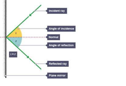 In the second example, if a light ray travelling along the normal hits a mirror, it is reflected straight back the way it came. The reflection of light from a flat surface such as a mirror is called spectacular reflection– light meeting the surface in one direction is all reflected in one direction.