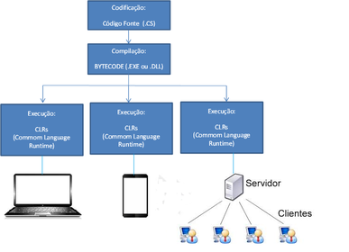 Na aplicações .NET, que suporta a linguagem C#, após a compilação é gerado um código intermediário chamado de Bytecode, que não é reconhecido pelo sistema operacional, mas que em tempo de execução é convertido para linguagem de máquina através da máquina virtual chamada CLR (Commom Language Runtime). Desta forma, a aplicação pode ser executada independentemente da versão do sistema operacional ou da CPU.