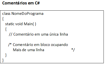 Os comentários podem ser definidos em uma única linha, ou em um bloco.Em uma única linha utiliza-se o // no início do comentário.Em bloco, o início do bloco de comentários deve começar por /* e terminar por */.