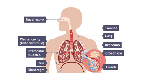 The trachea branches into two bronchi (one to each lung).Pleural membranes surround each lung. Cartilage rings in the walls of the trachea help to keep it open.The bronchi split into smaller and smaller tubes called bronchioles. These end in microscopic air sacs called alveoli. There is a musculardiaphragm below the lungs