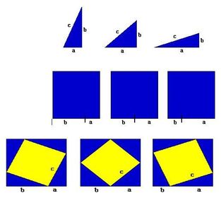 triangles. Here it is for our example squares:In each case, the area of the larger blue square is equal to the sum of the areas of the blue triangles and the area of the yellow square. Since the area of a square is (sidelength)2 and the area of a triangle is 1/2(base)(height), we can write the equation: (a+b)2 = c2 + 4[(1/2)ab] Simplifying:(a+b)2 = c2 + 4[(1/2)ab](a+b)(a+b) = c2 + 2aba2 + 2ab + b2 = c2 + 2ab Now subtract the 2ab from both sides of the equation, and we have the Pythagorean theorem: a2 + b2 = c2