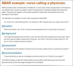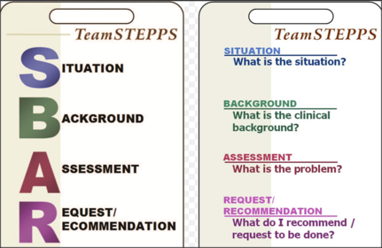 SBAR is an easy-to-remember, concrete mechanism useful for framing any conversation, especially critical ones, requiring a clinician’s immediate attention and action. SBAR
