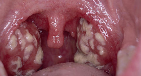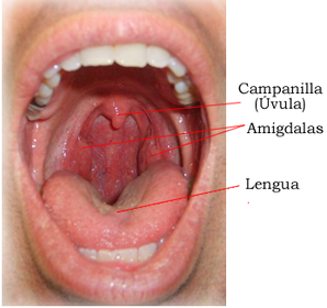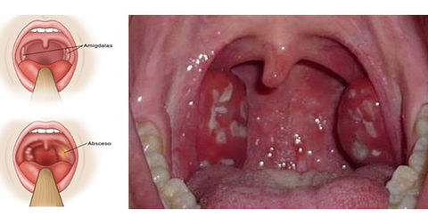 Las amígdalas por lo general están enrojecidas y pueden tener manchas blancas.