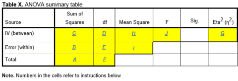 H-sum of squares between/between df (C/D) I-sum of squares within/within df (B/E)
