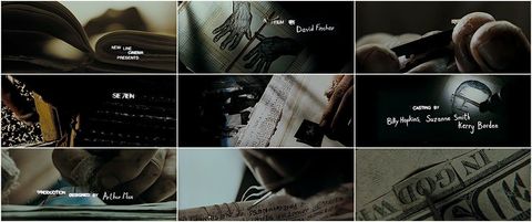 This screenshot shows more colour than the previous screenshots, however again the white writing used is on a dark low key lighting background. The style of font which has been chosen to display the title of the film 'Se7en' and the rest of the information which has been shown in previous screenshots looks uneven and jagged and this portrays a horror/ thriller type feel to the audience.The object on the right seems to appear to be a cigar which has been lit and not smoked a lot which shows that there is a person in the room at that moment, even though they have not been shown yet which causes anticipation to build up in the audience.