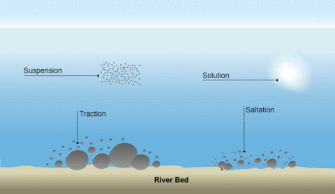 Saltation - small pebbles and stones are bounced along the river bed.