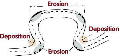 Deposition is common towards the end of a river's journey, at the mouth.