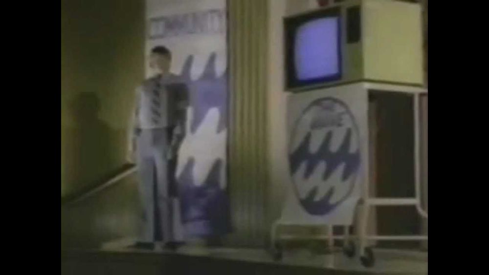 Caption: : This is a picture of Mr. Ross next to the television set in which he is going to show them Hitler. Below the television set is The Wave logo.