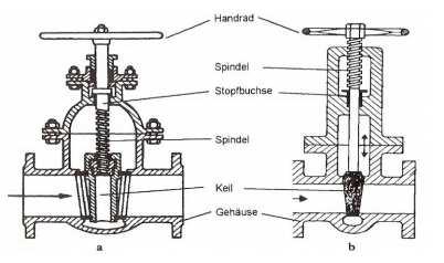 Häufigste eingesetzte Absperrvorrichtung Abdichtung durch Anpressen des Ventilkörpers/kegels an den Ventilsitz Öffnen, Absperren und genaue Regulierung des Durchflusses 2 Umlenkungen im Ventil Strömungsrichtung (Einbaulage) vorgegeben Rel. hoher Druckverlust |