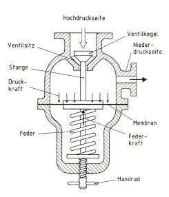 • Überführung von Gasen, Dämpfen oder Flüssigkeiten von hohem zu niedrigerem Druck • Einstellung Solldruck über Federspannung • Druck auf Membran öffnet/schließt Ventil |