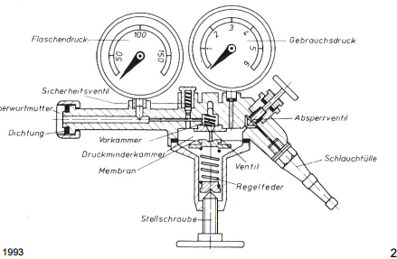 • Einstellung Flaschendruck (- 300 bar) auf Gebrauchsdruck (≈ 1 bar) • Druckminderventil + 2 Manometer + Sicherheitsventil + Absperrventil |