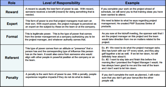 | Describe the five types of Power and give an example to each one of them in the context of project management: |