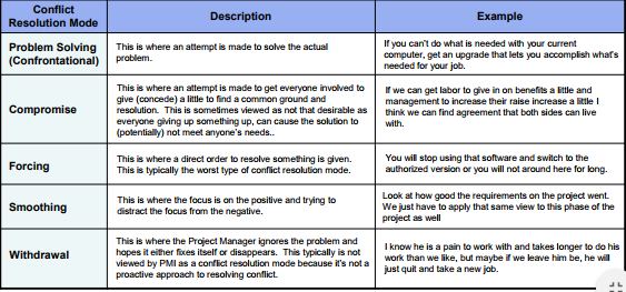 | Which conflict resolution style is warranted in this case? Why? How might some of the other resolution approaches be inadequate in this situation? | This question requires students to think in terms of others and their likely responses to various behaviors. Should the project manager develop an approach that leads to confrontation? If so, what will be the outcome? First, confrontation techniques take time; therefore, a meeting with these two people should be given sufficient time for the issues to come out and then for resolution to occur. Should the project manager arbitrate the conflict? Ignore it? Each of these options must be explored and the downside addressed. Usually, by the time an open confrontation has occurred, the more benign approaches such as ignoring or accepting it may no longer be viable options. |